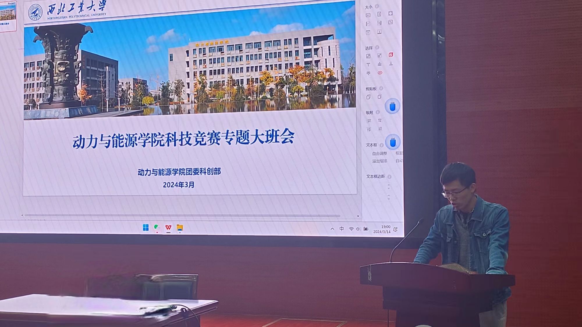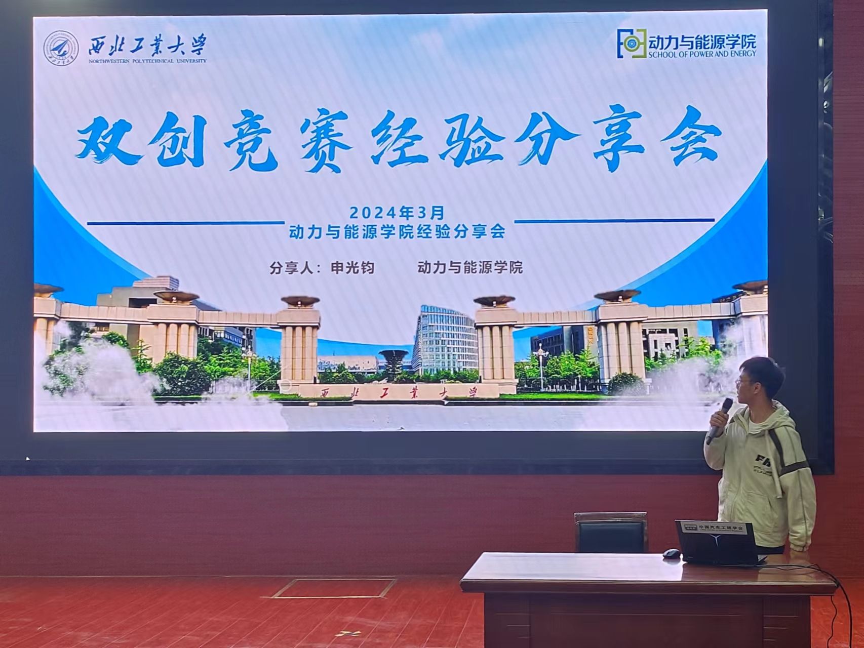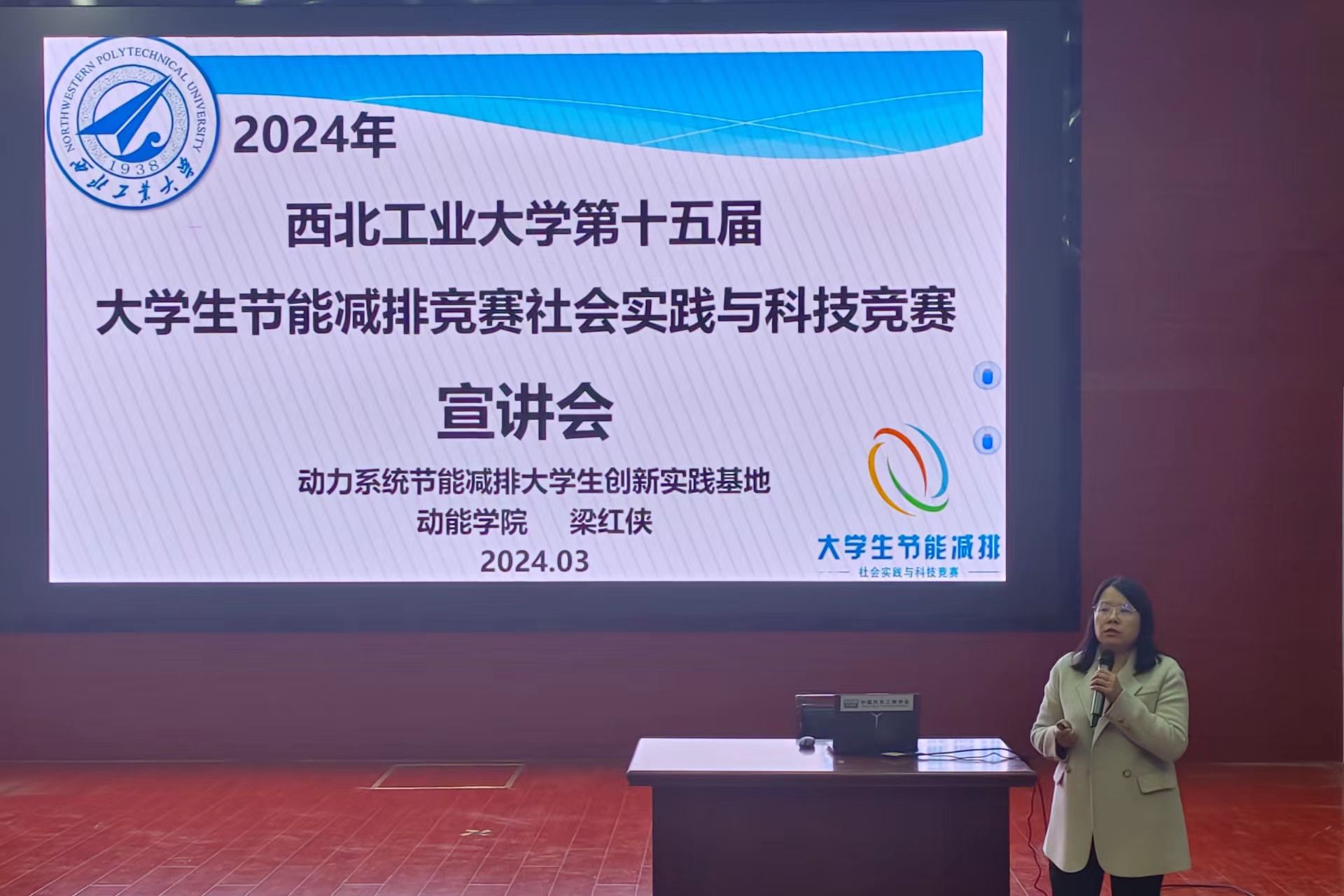 梁红侠教授分别从节能减排基地简介、国赛介绍、历届获奖情况、校赛介绍、参赛筹备要点、获奖作品展示等各方面,充分详细的介绍了有关竞赛的相关内容,并鼓励动能学院的学生积极报名,踊跃参赛。
