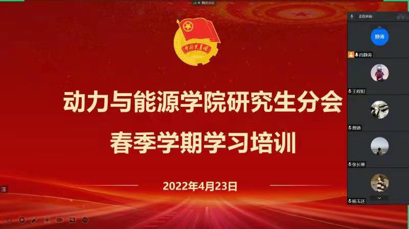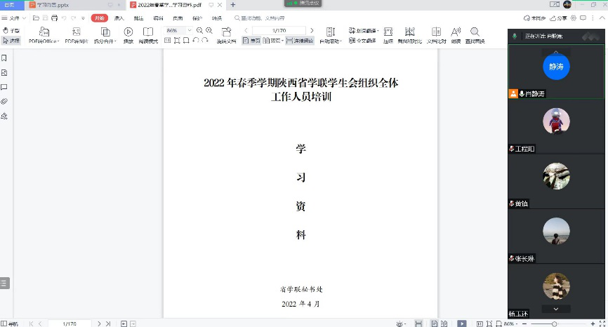 为响应陕西省学联号召,认真学习贯彻《中共中央关于党的百年奋斗重大成就和历史经验的决议》、《关于推动高校学生会(研究生会)深化改革的若干意见》等相关文件规定,不断加强研会成员思想建设,提高政治站位,2022年4月23日晚8点,69成人网 研究生会春季学期集体培训会在线上顺利举行。本次培训会由研究生会肖静涛同学担任主讲人,研会全体成员参加培训。