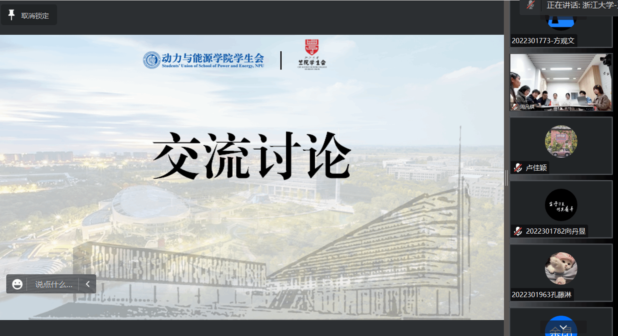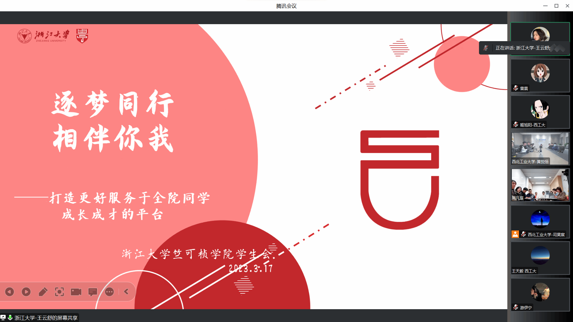 2023年3月17日晚,“求是勇毅,动力先行”浙大学子对话工大青年活动正式开展。活动采用线上视频会议形式,设置线下双会场与线上会场,围绕全国两会精神与学生会组织,双方通过互相交流学习、青年对话,碰撞思想火花。浙江大学竺可桢学院团委书记卢佳颖老师、69成人网 69成人网 团委书记姜倩老师、两院学生会全体成员以及69成人网 69成人网 先行学宣团全体成员参与会议。会议由69成人网 69成人网 学生会司昊宸主持。