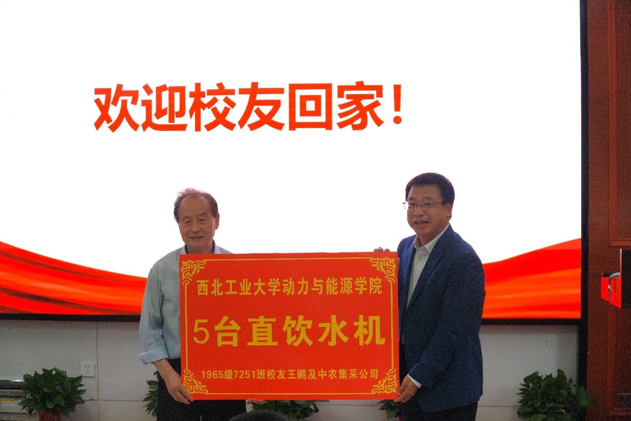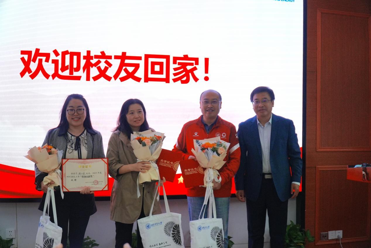 接下来,王占学为参与2024年四川招生工作的成都校友会校友们颁奖,以表彰他们对学校招生工作作出的贡献。随后,学院接受了1965级7251班王鹏校友捐赠的直饮水机。最后,学弟学妹们向在场的所有校友们赠送了鲜花及纪念品。