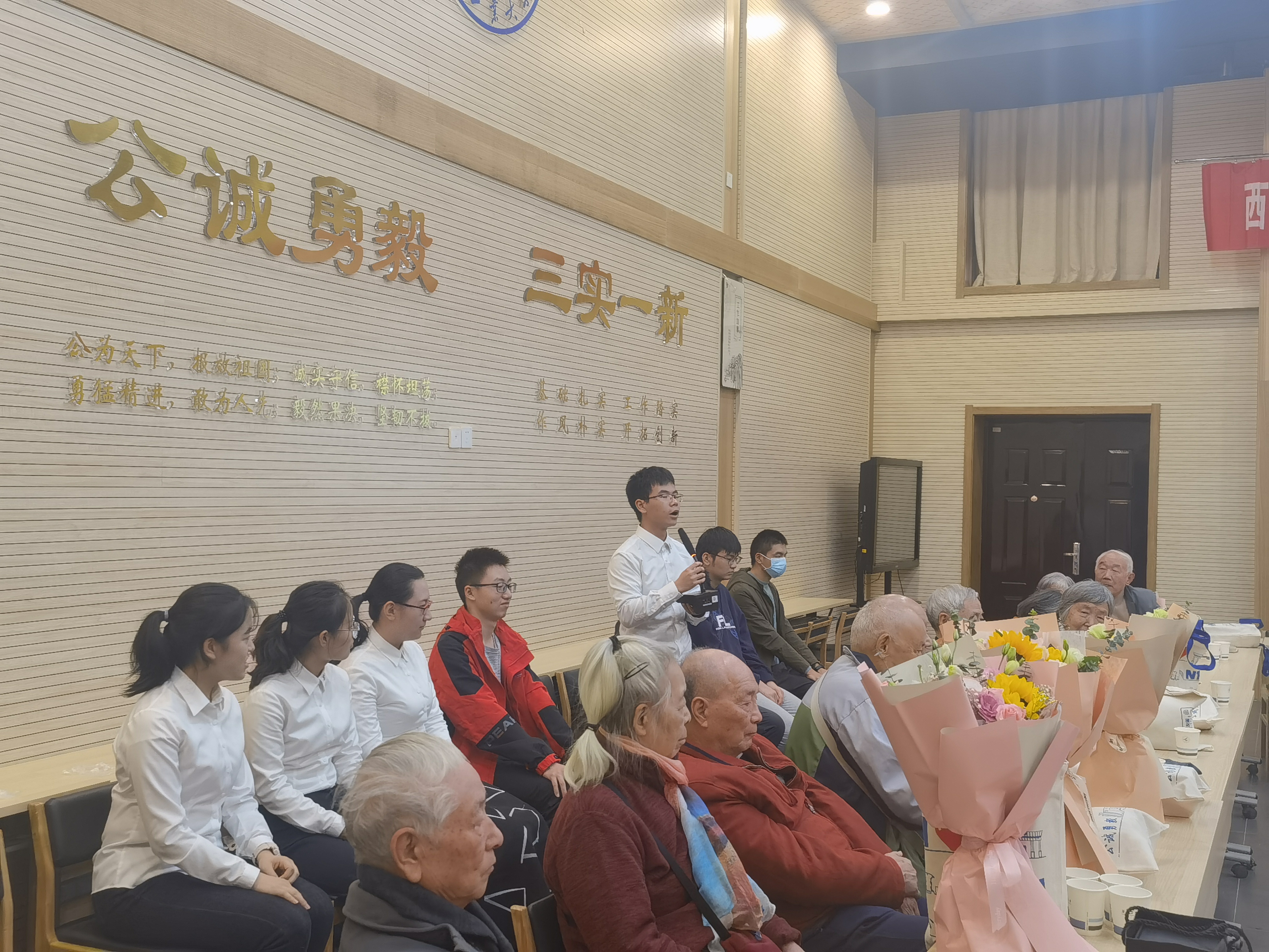 随后,凌云班学生代表也为校友们佩戴了校徽并献上鲜花。王占学院长也向校友们发放学院的纪念品。