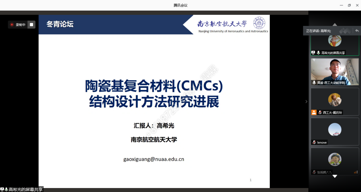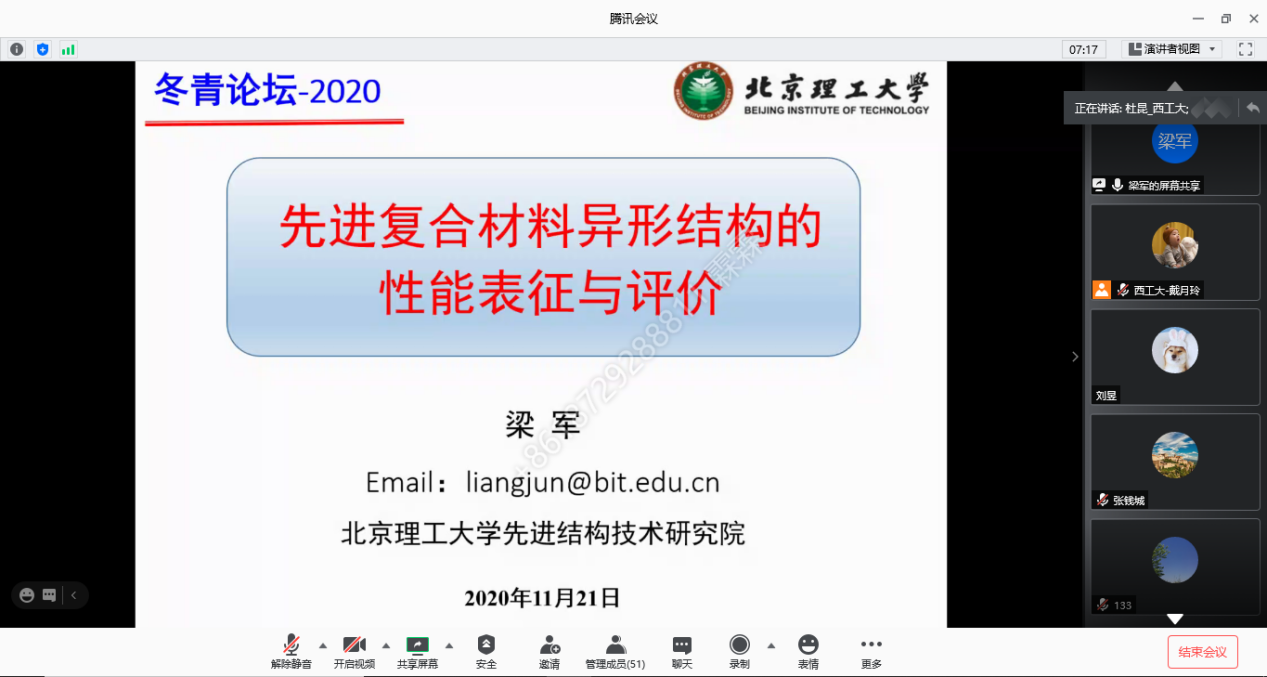 应冬青学会邀请,20201121日,北京理工大学梁军教授和南京航空航天大学高希光教授分别针对复合材料研究中的热点和难点问题,对《先进复合材料异形结构力学性能表征与评价》和《陶瓷基复合材料结构设计方法研究进展》进行了精彩讲授。