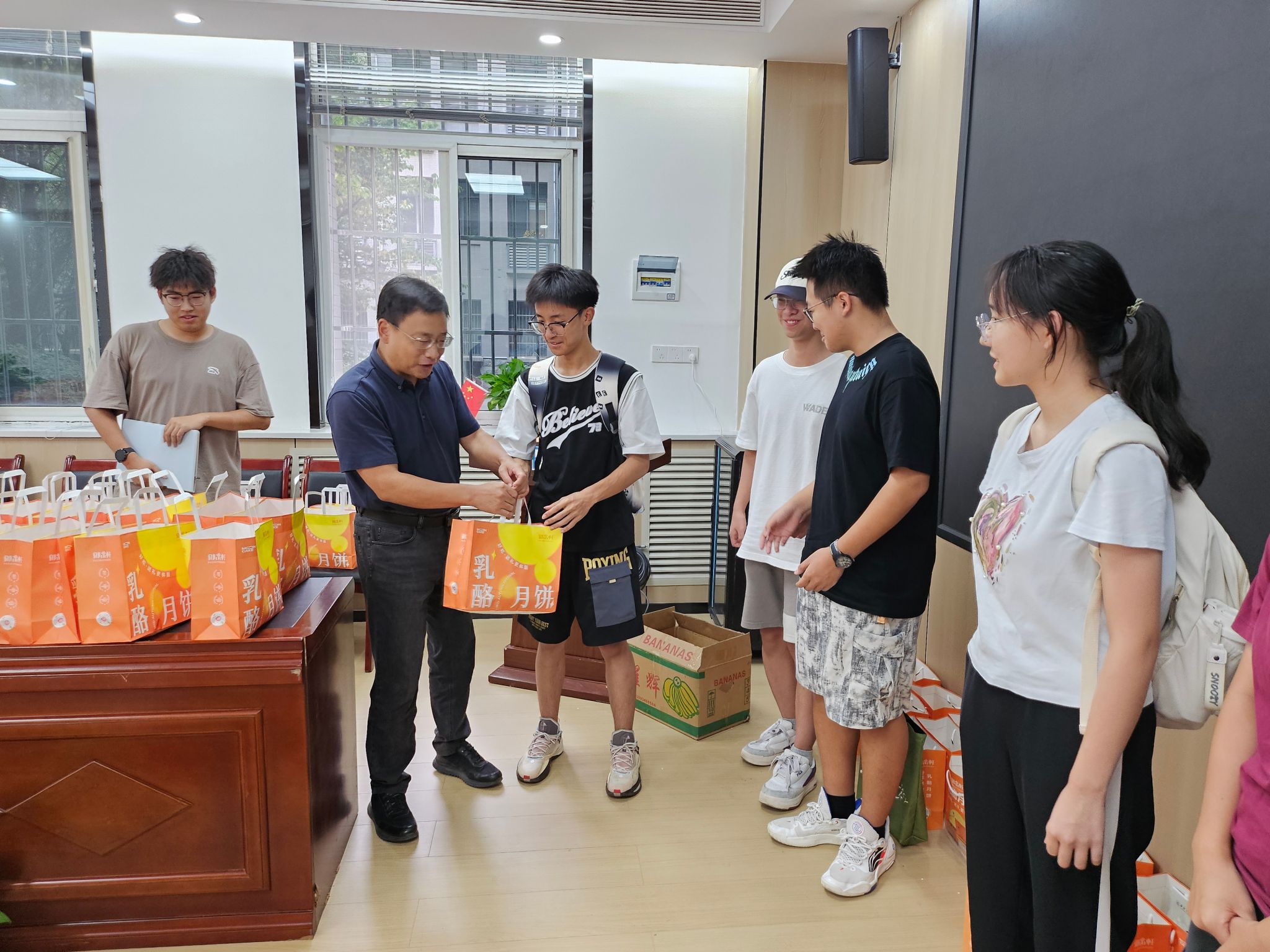 党委书记王占学,副书记徐永超以及各年级辅导员老师们一起为同学们送上了精心准备的中秋慰问礼物。每一份礼物不仅饱含节日的祝福,更寄托着学院对学生们的深切关怀和期望。通过这次走访慰问,学院希望让同学们在异地求学期间依然感受到家的温暖,拉近了师生之间的距离,也让节日的关爱融入每位学子的心中。
