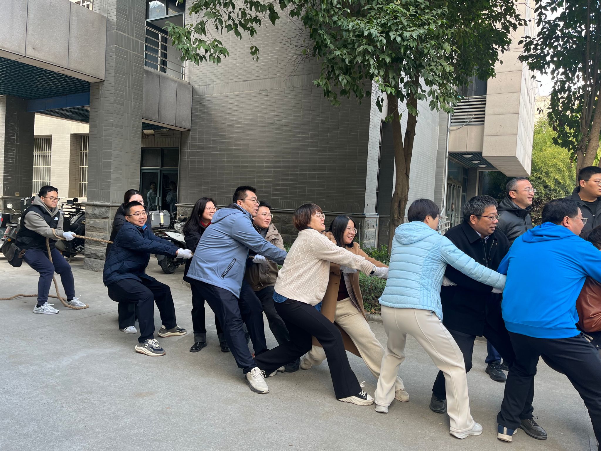 工会组织的教职工拔河比赛在学院院楼举行。此次活动旨在增强教职工体质,发扬体育精神,进一步增强学院的集体荣誉感。全院教职工积极响应,共组织五支队伍、八十余名队员参加比赛,现场气氛热烈,欢呼声此起彼伏。