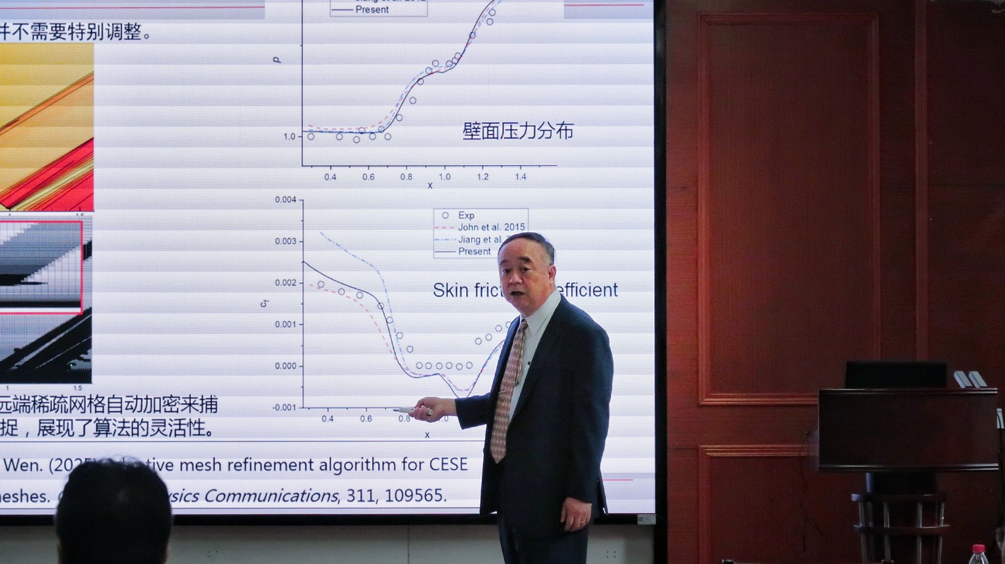 随后,温教授为学院青年教师及研究生作题为《自适应算法研究进展与三维弯曲管道爆轰波仿真》的学术报告,分别介绍了自适应算法研究进展和三维弯曲管道爆轰波两个方向的研究成果。