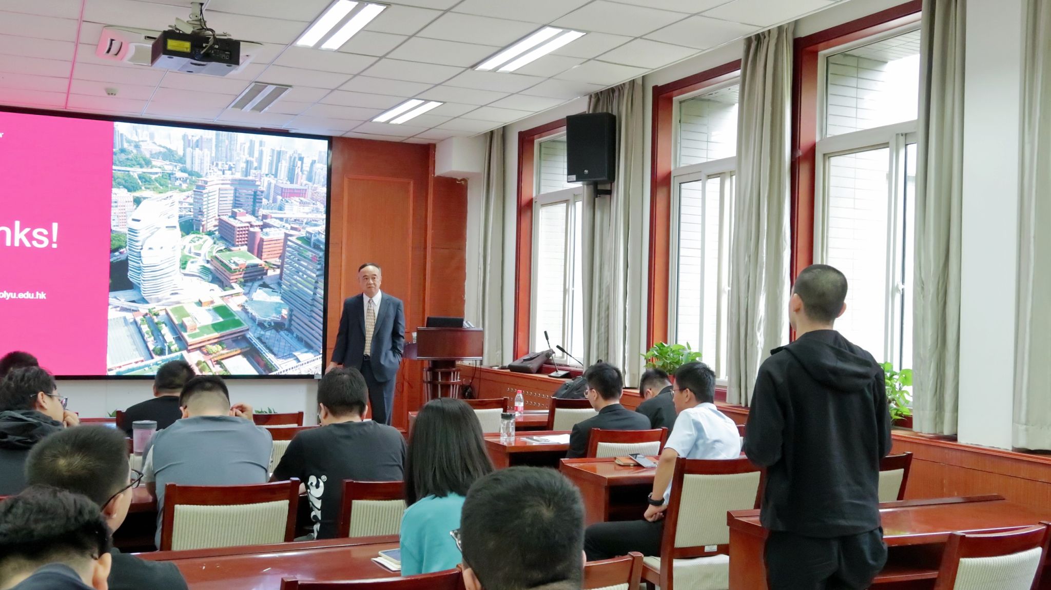 温教授简要介绍了学院9名赴香港理工大学进行毕业设计学生的学习生活情况,对他们的毕设成果进行了肯定,他表示期待双方在学生联培、学术研究等方面开展更加深入的交流与合作,开展双向、可持续的人才联合培养,促进学术交流。