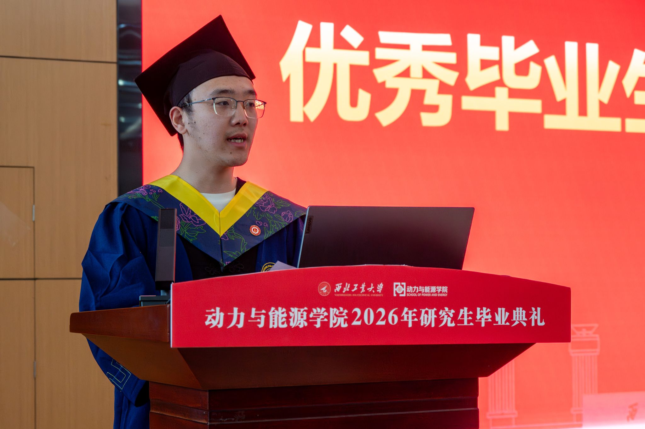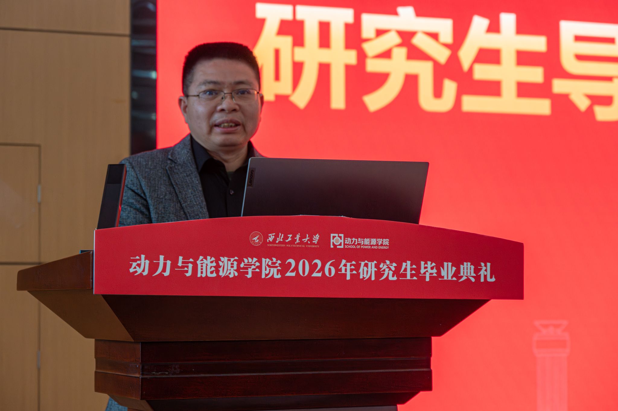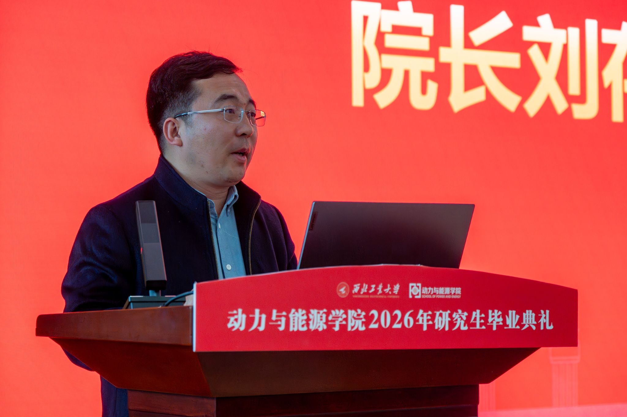刘存良院长在致辞中祝贺2026届研究生顺利毕业,向导师与家长致以诚挚感谢,并对同学们提出四点希望:一是永葆求知之心,以严谨求学态度融合专业知识与前沿科技,在精进中成就自我;二是厚植家国情怀,将个人理想融入国家发展,以实干担当传承西工大优良品质,在笃行中续写荣光;三是坚守实干本色,以“总师型”人才标准要求自己,在攻坚克难的磨砺中勇毅前行、成就事业;四是常怀温暖之心,懂感恩善协作,做一束光,在前行中照亮自己、温暖他人。
