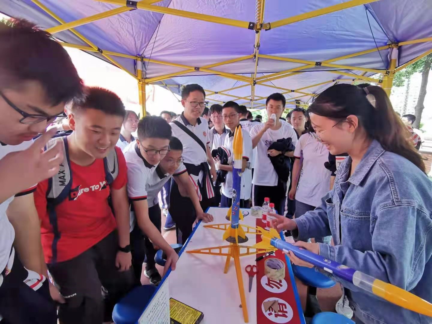 绵阳中学科技节启动仪式一经开始,我校的科技作品展区便人山人海。科普志愿队分别对参展的八件大学生科技作品进行了介绍并发射了水火箭,中学生们在整个观看过程中热情度极高并不停欢呼,掌声不断。