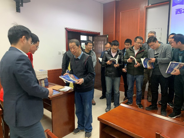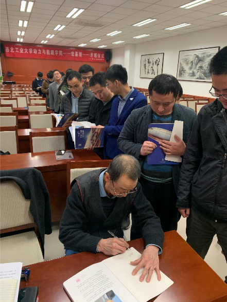 开班仪式的最后,由闫育周书记和蔡元虎教授一同为青年教师们赠予珍贵教材《喷气发动机》中文版,青年教师主动排队等候蔡元虎教授亲笔签字,最后全体参会人员合影。