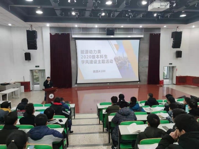 2020年12月4日,为帮助同学们树立热爱学习、善于学习的观念,营造良好的学习氛围,能源动力类2020级本科生在教学西楼A100举行学风建设主题活动。班会由辅导员田放主持,2019级本科生辅导员李一帆参加了活动。