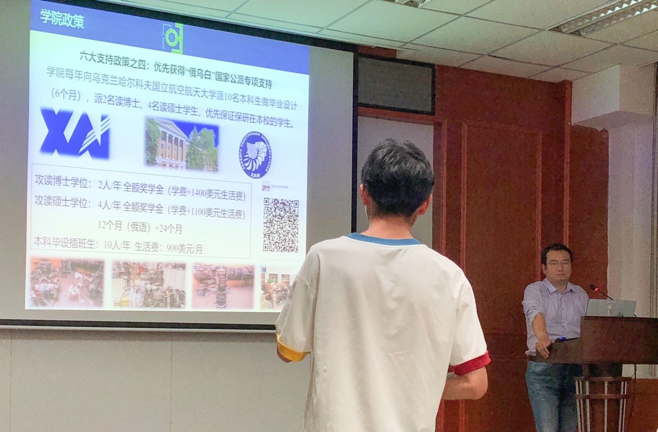 缑林峰副院长为同学们介绍了学院国际合作培养项目,并以“中乌先进飞行器动力技术专业人才培养项目”为例,从选派专业范围、留学单位及留学期限、申请条件及要求、申请及选拔程序等方面进行了详细的指导,就同学们提出的问题进行了答疑。