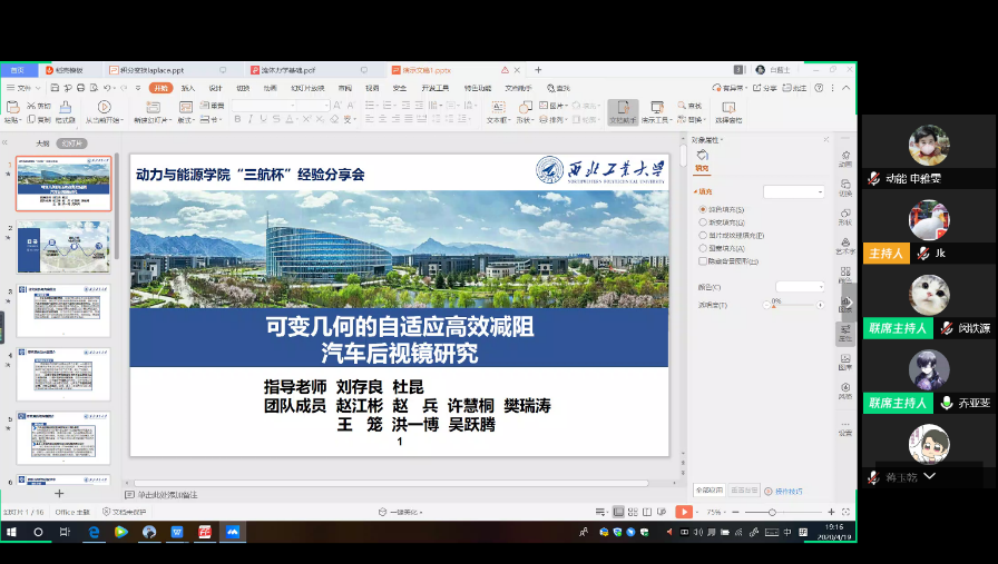 首先,一等奖项目“可变几何的自适应高效减阻汽车后视镜研究”负责人赵江彬同学对项目成果进行展示,该项目根据后视镜气动特性对其几何外形进行优化设计——添加可变翼型并控制翼型与其外表面的切平面之间的角度,以破坏边界层分离现象,改善后视镜附近区域的流场,达到减小干涉阻力的目的。赵江彬同学强调,参加科技竞赛不仅是对创新能力的锻炼,同时也可以提高团队协作能力、论文撰写能力,有利于大学生综合素养的提升。