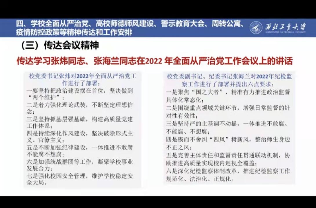 在225会议室召开2022年学校全面从严治党精神传达和工作安排会议,应学校防疫要求,会议采取线上线下同步进行的方式,大会由学院党委书记闫育周主持。