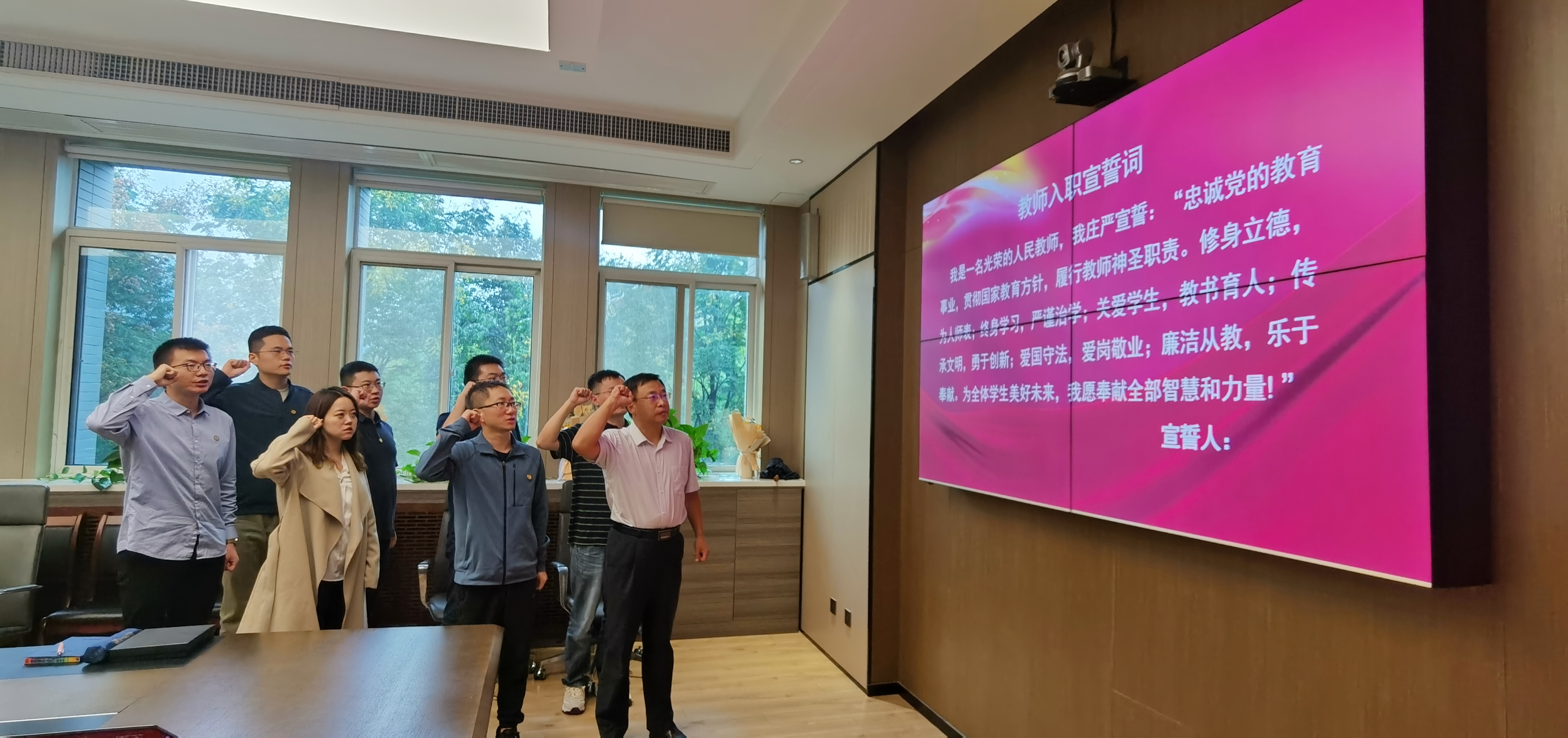 之后在王占学的带领下,新教师进行了庄严的入职宣誓仪式。他们紧握右拳,誓言铮铮、铿锵有力地面对国旗表达对党的教育事业的忠诚和对教书育人神圣职责的坚守。