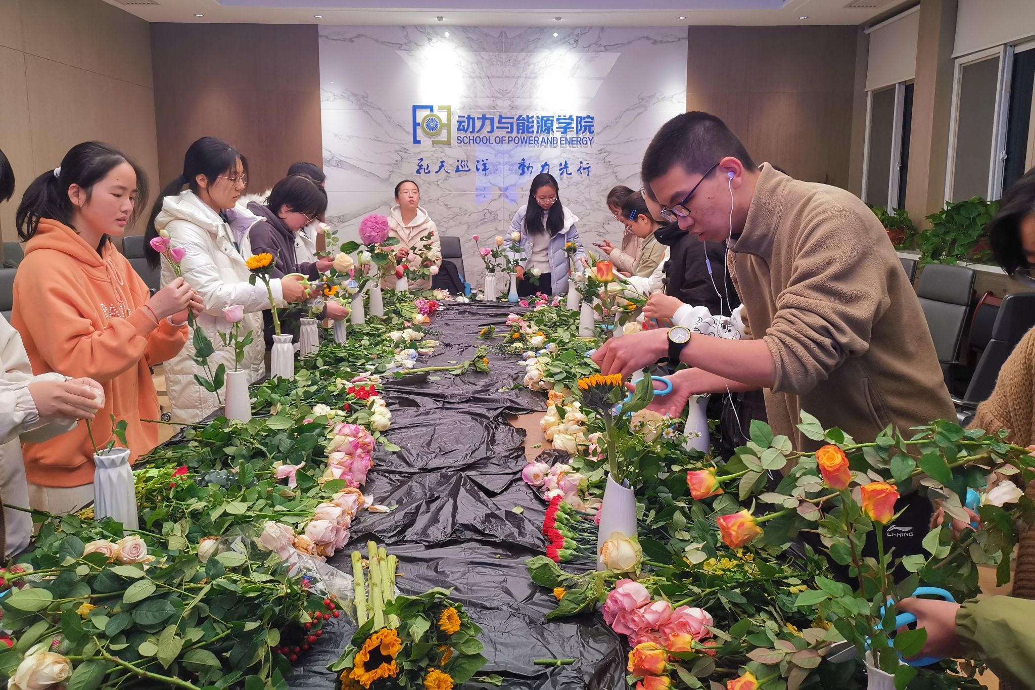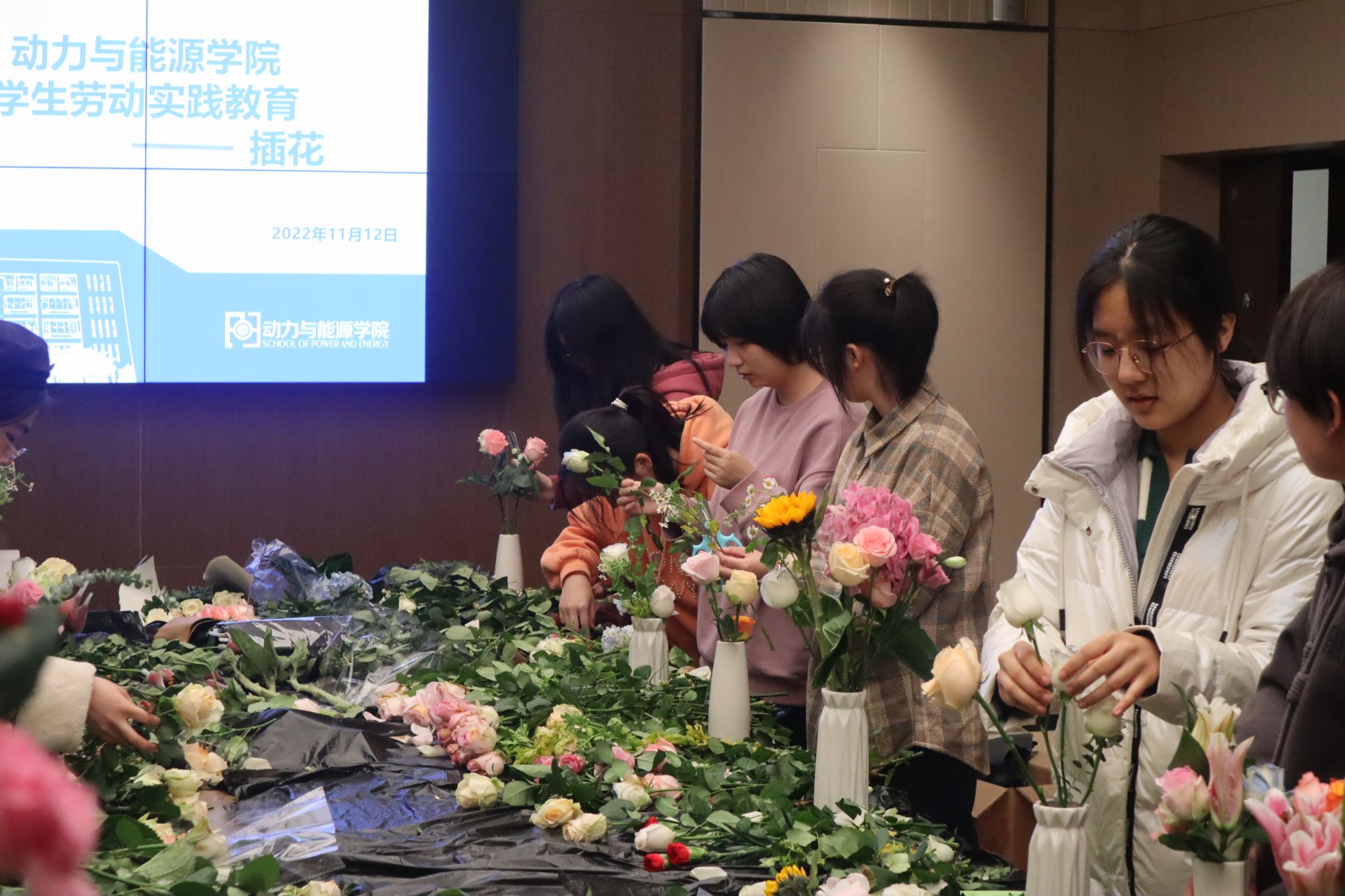 魅力巾帼,花漾芳华。踏入插花活动现场,阵阵花香扑鼻而来,映入眼帘的是以饱满的热情沉浸在插花创作中的同学们。代表纯洁的百合,寄托思念的红豆,充满浪漫的玫瑰……一双双灵巧的双手组合出一束束具有不同韵味的插花作品。花香与浓情洋溢在现场的每个角落!