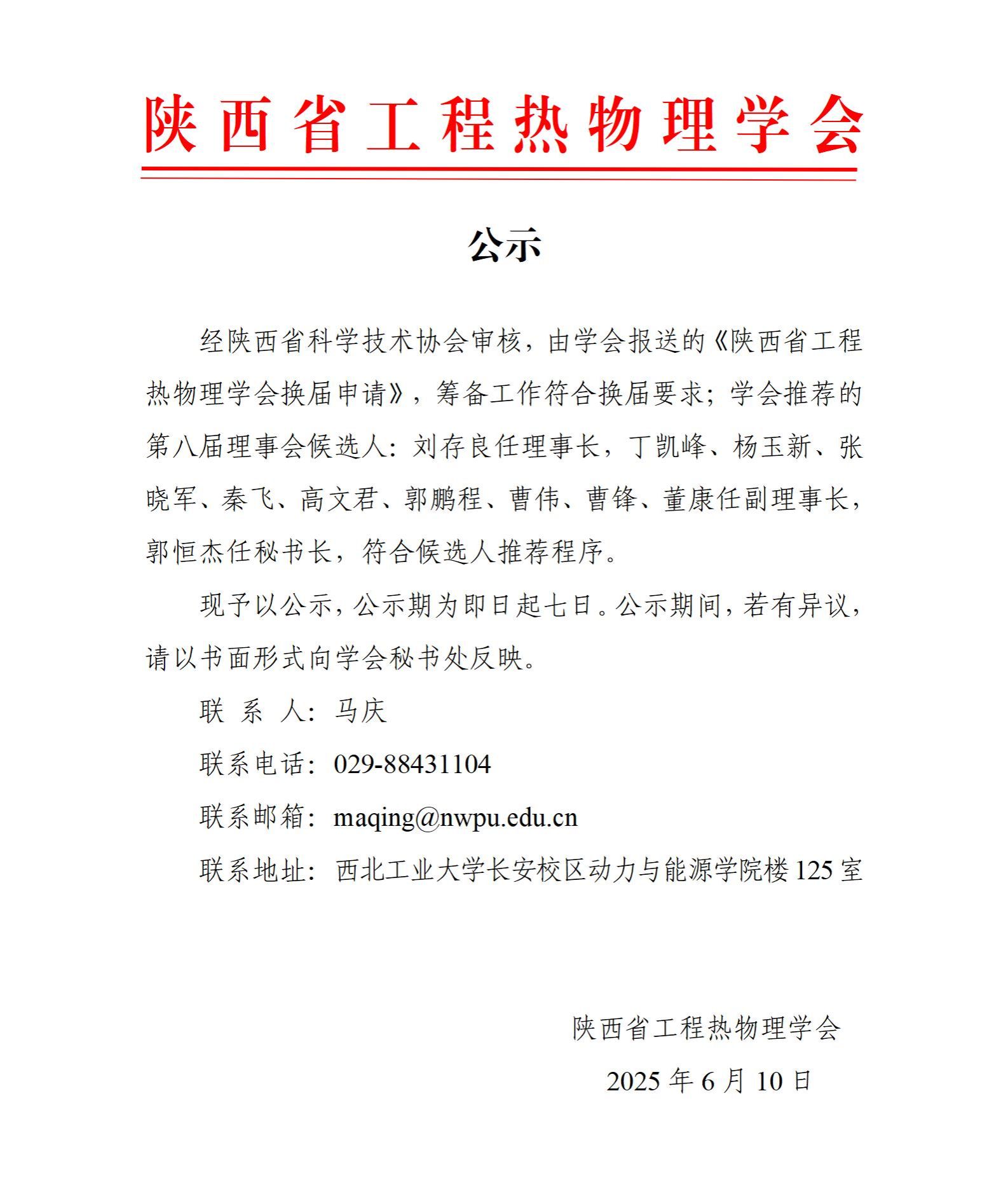 陕西省工程热物理学会公示