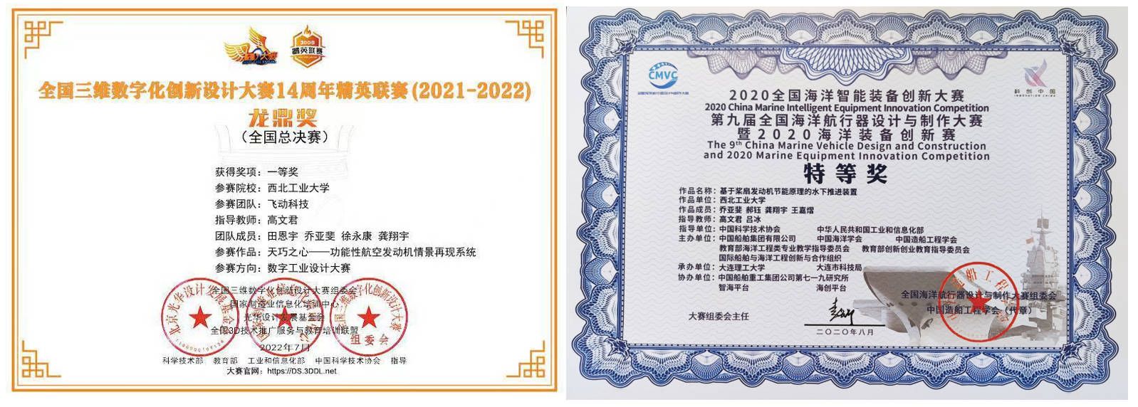 在关心学生课程学习之余,高老师还积极指导学生参加各类学科竞赛,组建并指导了包括“酷轮科技”和“飞动科技”为代表的多支优秀团队。其中,“酷轮科技”提出了一种“内外双流道高效螺旋桨”技术,学生在大一学年即荣获全国海洋航行器设计大赛特等奖和全国节能减排竞赛一等奖,团队被评为19-20学年“模范学生团队”,成员最后全部免试保送研究生;“飞动科技”专注于航空发动机创新技术开发,申请的5项发明专利仅一年即获授权,团队先后荣获全国三维数字化创新设计大赛一等奖、iCAN创新创业竞赛西北赛区一等奖等省级以上竞赛奖项6项,同样也获得了“模范学生团队”的称号,其中2人获得“航空强国中国心”教育基金创新奖,2/3成员免试保送研究生。此外,高老师还指导了国家级“大创”项目4项、省级“大创”项目3项,累计获得省级以上学科竞赛奖励和项目超过15项。