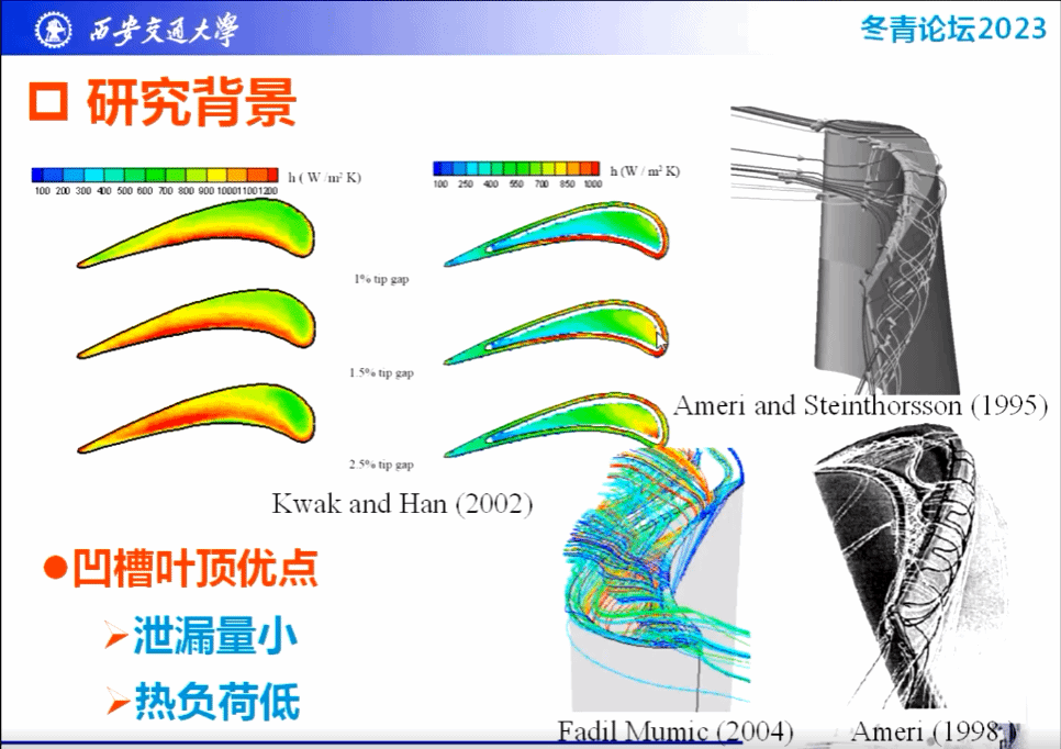 晏鑫教授首先概述了航空发动机叶顶间隙流产生的原因及其可能造成的危害,详细对比了燃气透平三种应用最广泛的叶顶型式,指出凹槽叶顶在燃气透平应用中优势显著。同时强调随着透平机械日益向高转速、高效率方向发展,由动静界面碰磨导致的叶顶气热性能退化机制成为涡轮转子叶片设计研究的前沿领域之一。