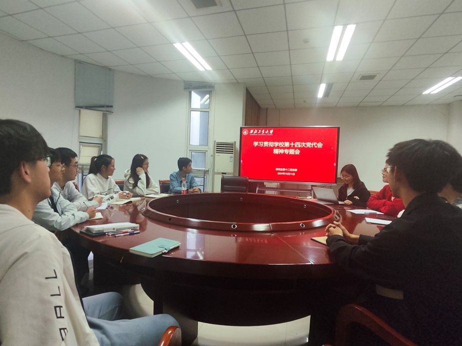 10月15日研究生第八党支部深入学习贯彻学校第十四次党代会精神。党支部书记周怡嘉带领大家学习学校第十四次党代会报告原文,并结合学生党支部工作实际以及专业背景等,分享参会感受和所思所想,带领支部党员从不同角度学习党代会的内容和精神。全体党员结合自身规划和发展参与研讨,纷纷表示要以党代会提出的一系列目标为指引,为学校奋力谱写中国特色世界一流大学建设新篇章贡献青春智慧和力量。