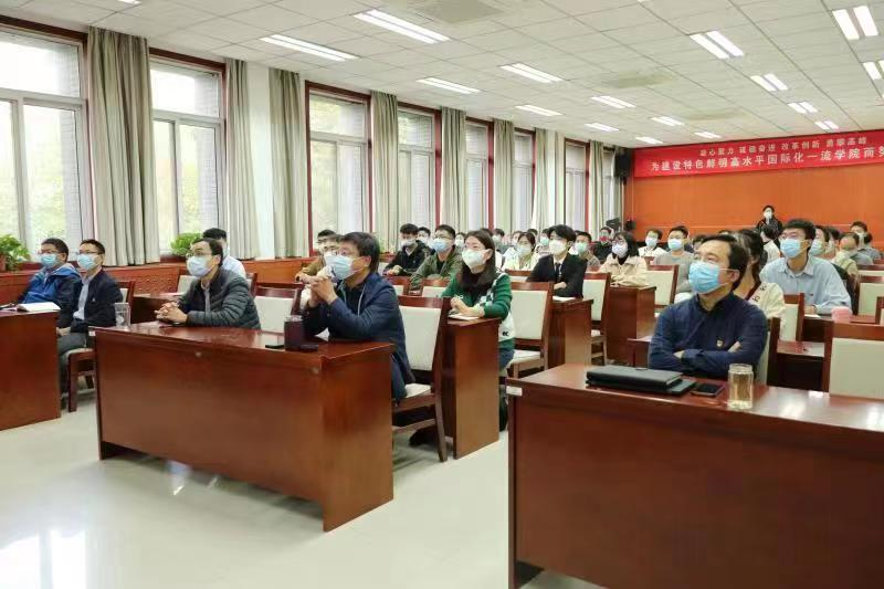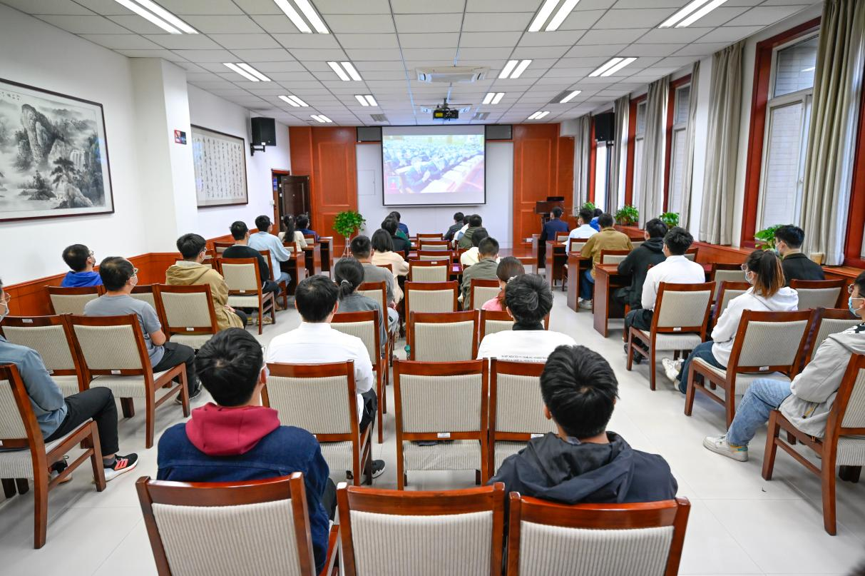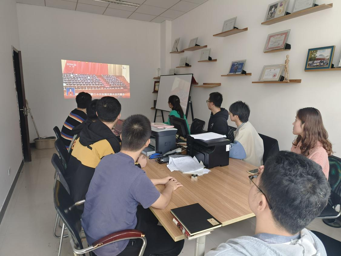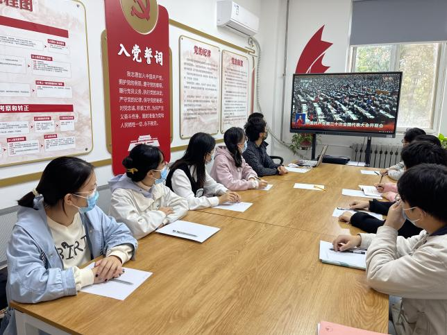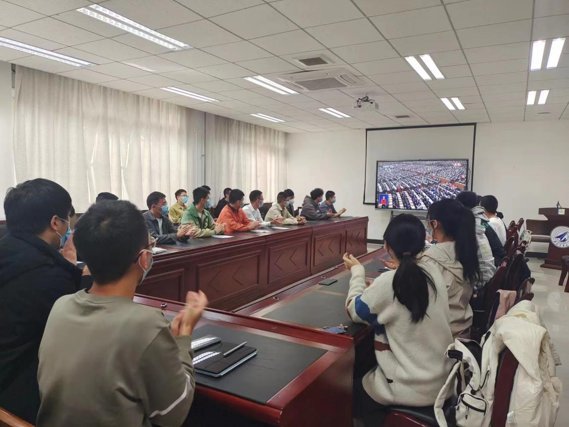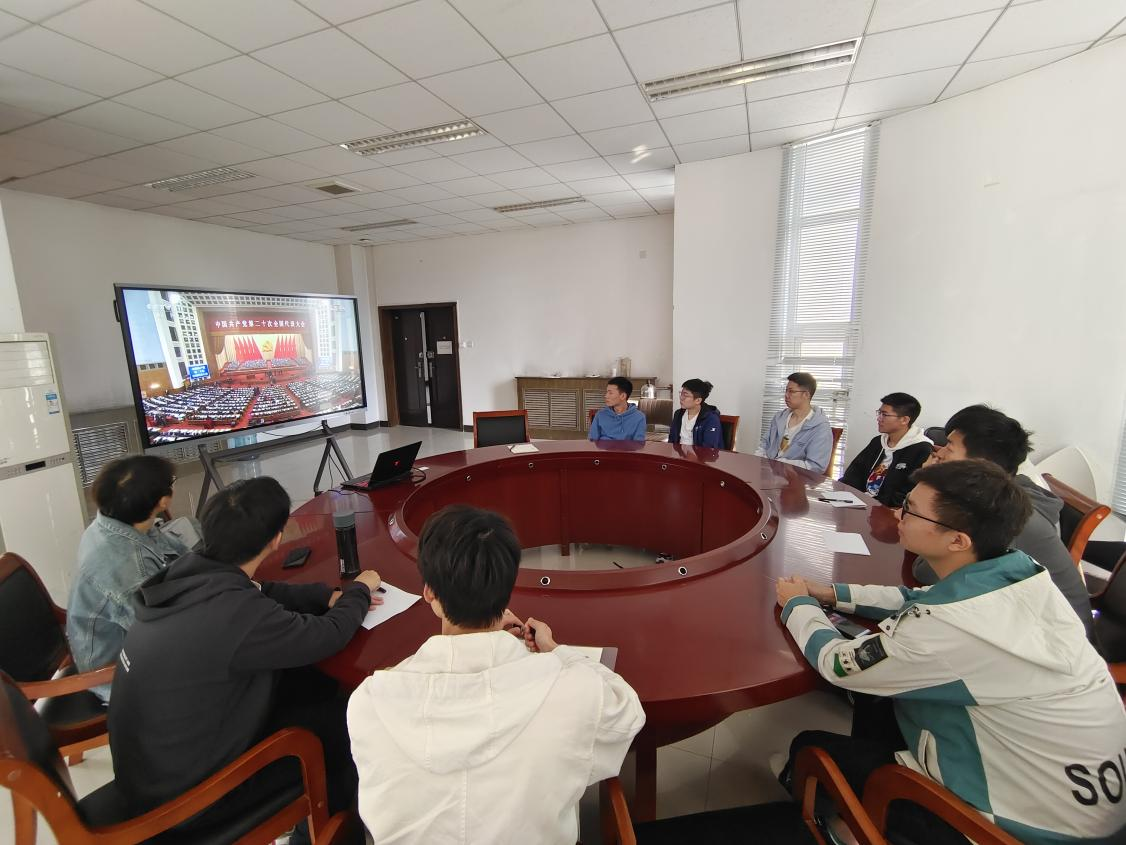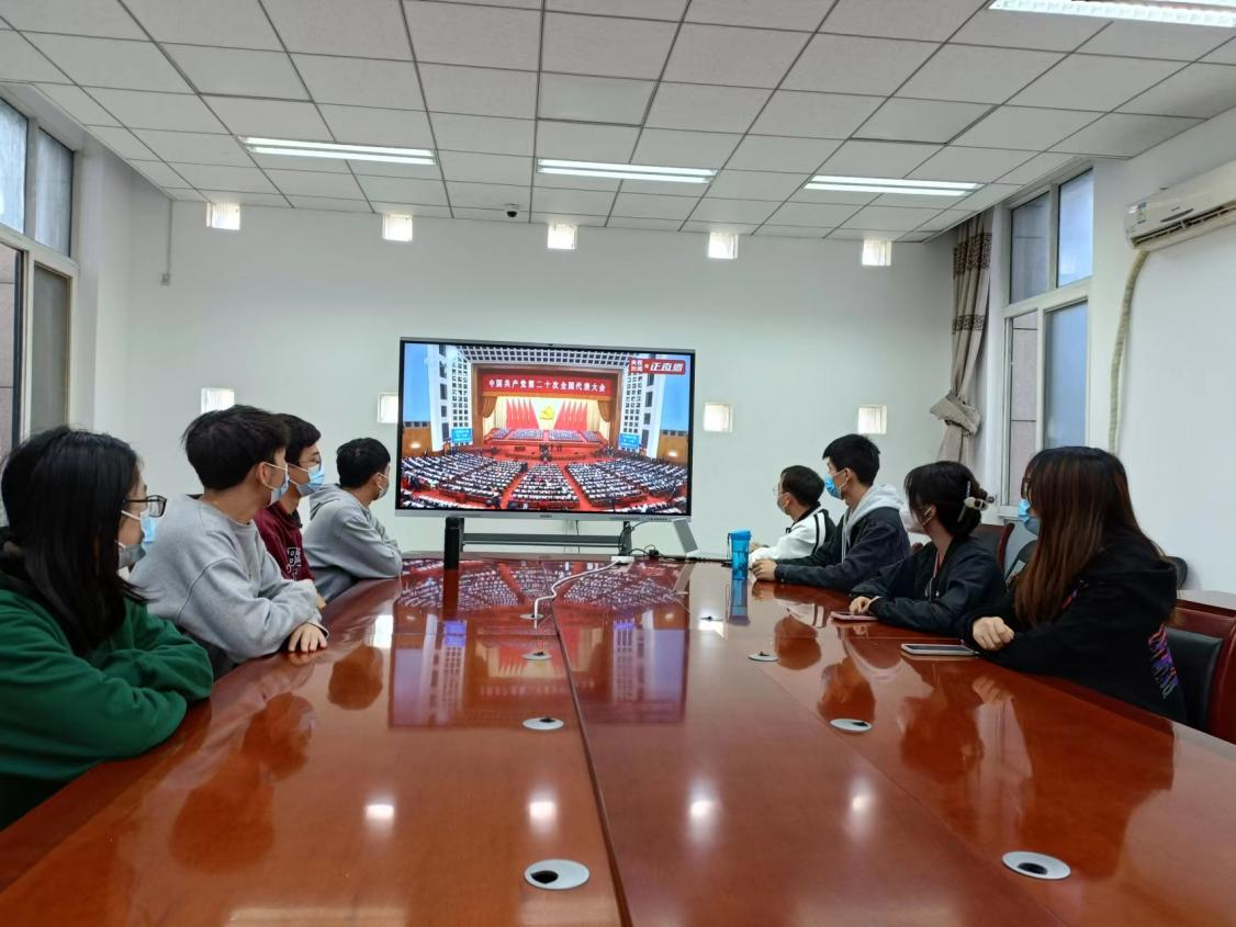 院领导、各党支部代表、团学组织代表和新生代表在学院楼225会议室集中收看中国共产党第二十次全国代表大会开幕会实况。