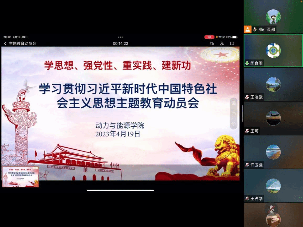 4月19日, 动力与能源 学院召开党委会(扩大)会议,研究部署学院学习贯彻习近平新时代中国特色社会主义思想主题教育工作。 全体院领导,党委委员,教工党支部书记等参加会议,党委书记闫育周主持并作工作部署。