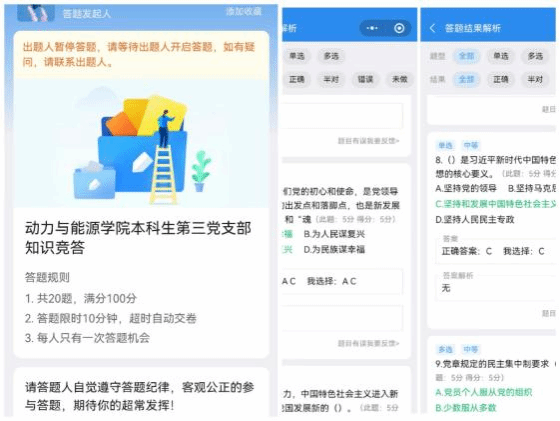 以竞促学——10月19日晚,在学院楼107会议室,宣传委员路培强首先为到会的22位党员介绍了本次知识竞赛的背景和目的,之后正式开始此次竞赛。本次竞赛创新的采用了“线下会议+云答题”的模式。线下会议,即大家聚在一起进行答题,方便赛后的沟通交流和总结,营造浓厚的学习氛围;云答题,党员们可通过扫码用手机答题,方便了成绩统计和答题情况分析。