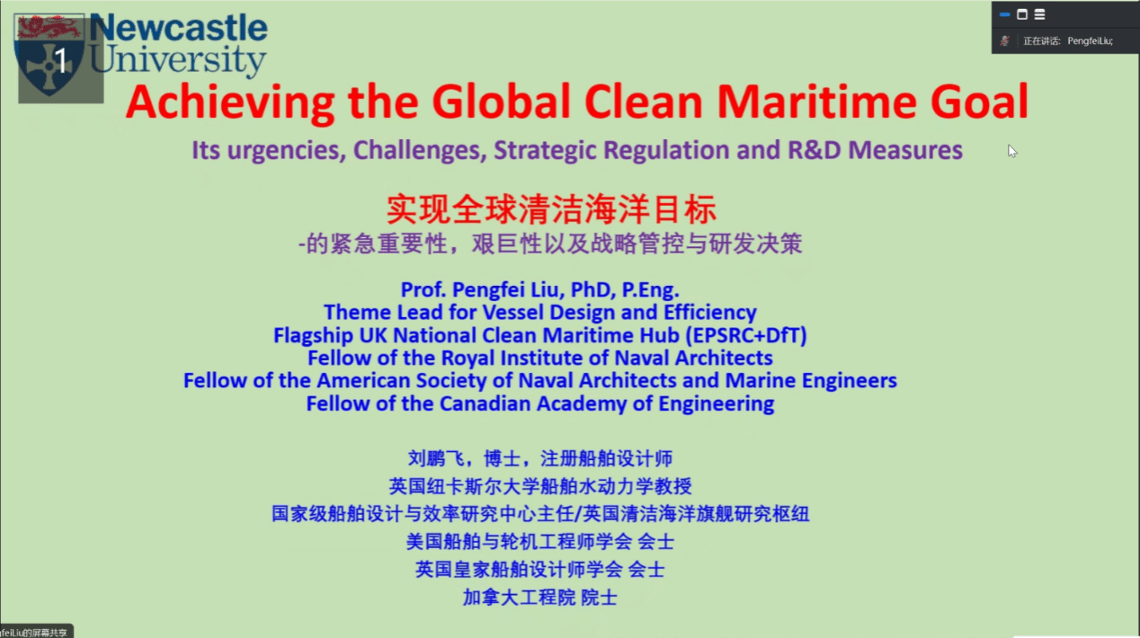 刘鹏飞教授首先介绍了实现全球海洋碳中和的重要性与紧急性;其次,围绕着四个方向深度剖析了实现全球海洋碳中和的艰巨性,提出需要多学科多工业领域的集体努力,提升船舶的技术成熟度等级。